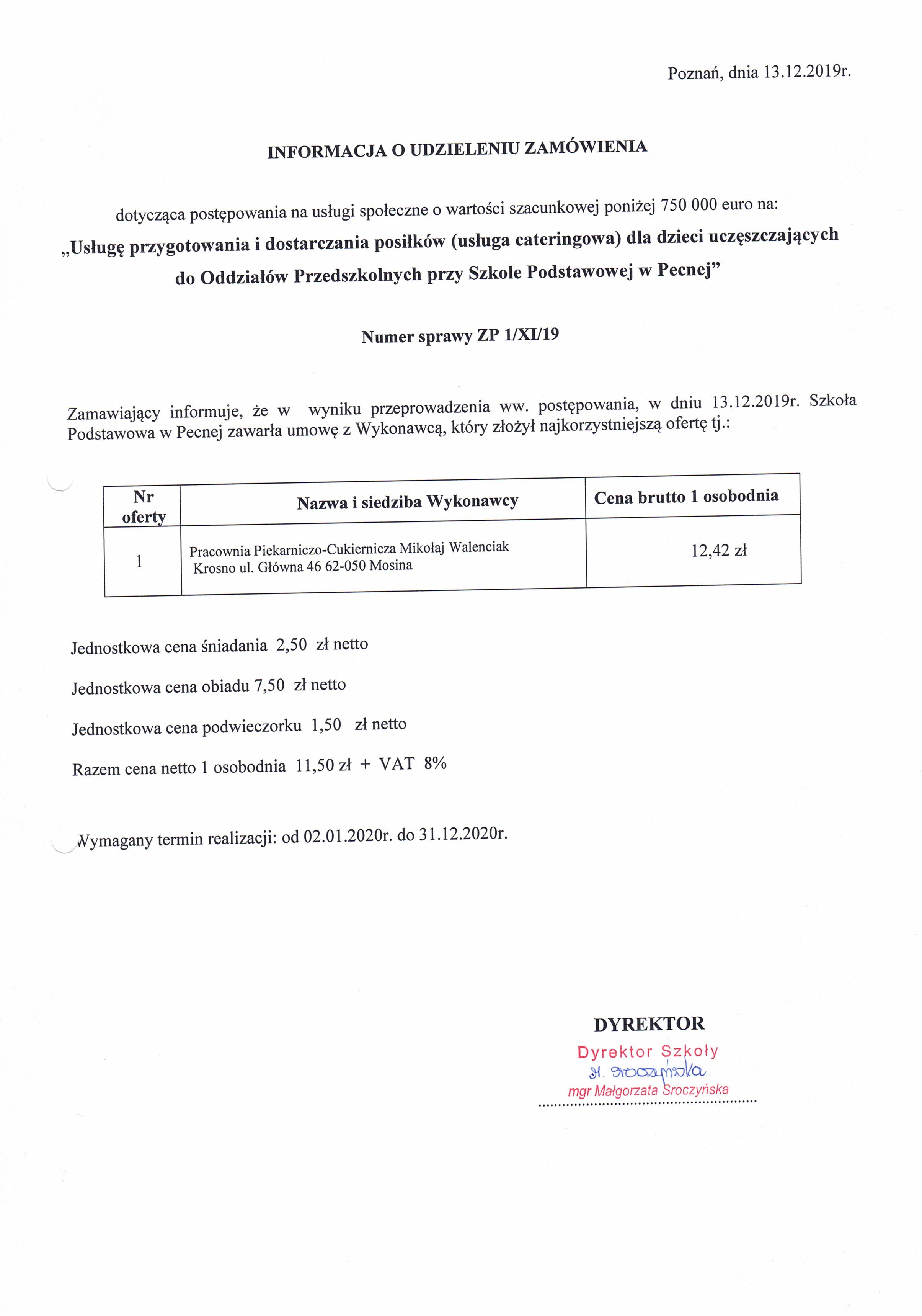 Dyrektor Szkoły Podstawowej w Pecnej informuje o udzieleniu zamówienia na świadczenie usług cateringowych dla oddziałów przedszkolnych przy SP Pecna.